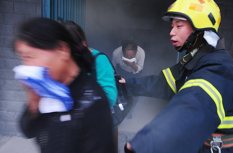 演練模擬電影城三樓2號廳線路短路引發(fā)火災,濃煙迅速蔓延,刺耳的警報聲響遍全城。隨后保安部開始在全城范圍內啟動廣播系統,組織人員疏散,撥打火警電話,并進行前期火災補救。