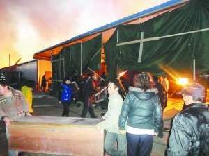十六日凌晨,20余輛消防車正圍在家具廠門外,明火已被撲滅,消防員正在排查以防復(fù)燃。庫(kù)房已坍塌,屋頂?shù)牟输摪逡褵龤А?/font>