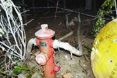 前晚再次來到黃鸝路東湖路口,遠(yuǎn)遠(yuǎn)_可聽見“嘩啦啦”的響聲,循聲找去正是白天所見有消防栓,其兩邊的出水口各接有一個(gè)消防水帶,接頭處和帶上的小孔正向外噴水,水帶內(nèi)的自來水流向10米之外的景觀湖。