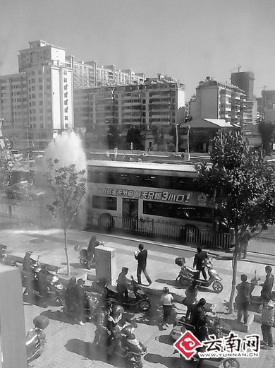 昨日中午1時(shí)30分左右,一輛61路雙層公交車(chē)行駛至北京路教苑賓館旁時(shí),為了避讓一輛并行的轎車(chē),顧此失彼地撞斷了路邊的一個(gè)消防栓,噴起的水柱足足有兩層樓高。