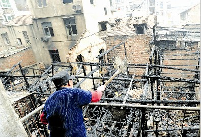 昨日上午10時(shí)許,記者再次來到事發(fā)現(xiàn)場看到,事發(fā)居民樓是一片老樓房,過火面積在300平方米以上,房頂已被燒穿,只剩下一些燒得焦黑的木架,受殃及的住戶正在清理殘?jiān)?/font>