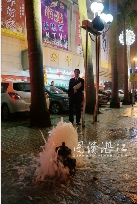 昨晚八時,“ 3.15” 消費者權(quán)益保護日還沒過,赤坎寸金公交車站下車后,剛拐到九二一路附近路口時,便見一群人圍在商場前一座“嘩嘩”地往外噴水的消防栓旁吵鬧著。